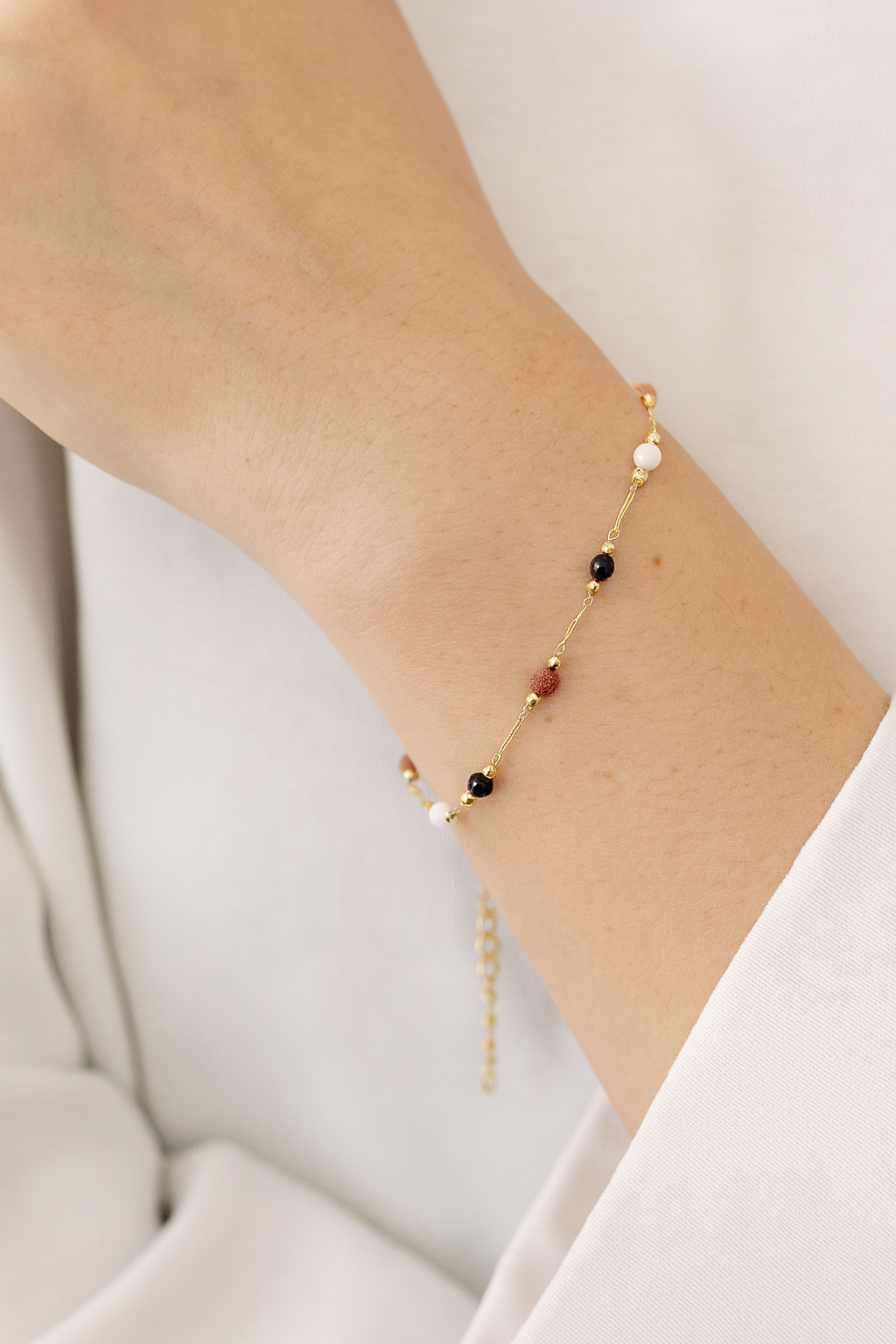 Rooted in earth tones and crafted for modern versatility, the Terra Dots set features a delicate gold-plated stainless-steel chain adorned with vibrant natural stone beads. Each bead is hand-selected for its color and character.